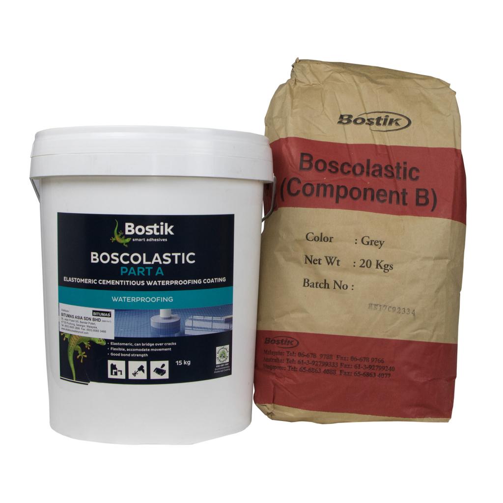 Boscolastic is a 2 component flexible acrylic polymer cementitious waterproofing coating that is mixed on site and resurfaced on concrete and other construction materials to waterproof. Boscolastic has excellent weathering resistance and crack bridging property.